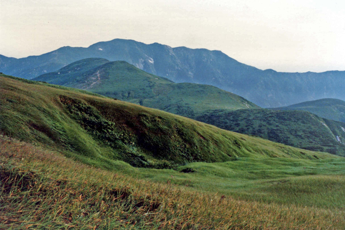| 西朝日岳には11時35分着。山頂から以東岳を見る。手前に寒江山。 このあとは霧に包まれた稜線を辿って竜門山、寒江山を越えて三方境の狐穴小屋まで行った。 記録では竜門山は午後1時、寒江山は午後2時50分にそれぞれ通過。狐穴小屋には午後3時40分着となっている。 寒江山付近ではピークを越えても越えても道は続き、三方境まで遠かったことが記憶にある。 |