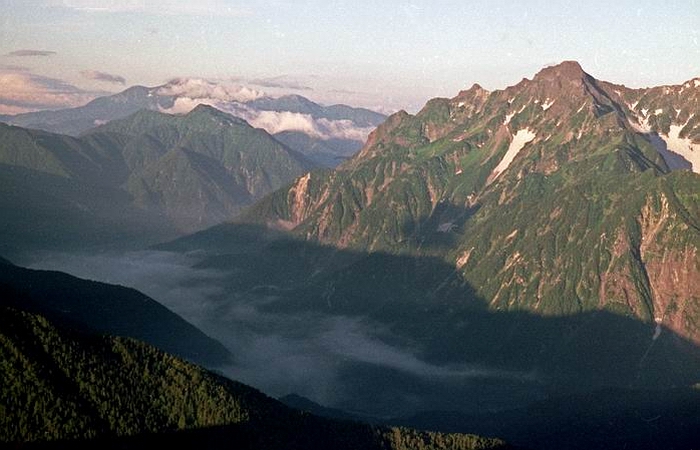 | 槍ヶ岳は雲の中。 その左に大喰岳と中岳。 |