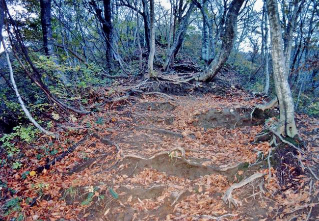 | 再び沢を渡ると最後の水場に出る。ここにはトチの大木が立っていた。 池まで1500mと書かれた道標を過ぎるとつづら折りの登りが始まり、はどなく稜線へと続く尾根に出る。ちょうど7時だった。 湿り気の多かった道も尾根に出てからは乾いて歩きやすくなる。落葉をカサカサと鳴らしながら高度を上げて行く。 |