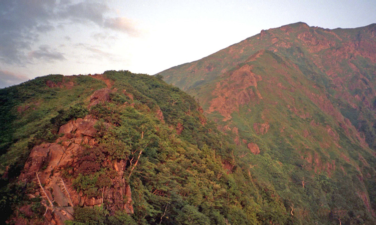 | 午前3時半に西黒尾根に取り付き、真っ暗な登山道を懐中電灯を照らしながら登って行く。 のっけからの急登だった。天気は良さそうだが湿気があり蒸し暑い。すぐに全身汗だくになる。 やがて鉄塔のある平地に出て一休みする。後にも先にも傾斜の緩やかなのはこの辺りだけで、あとは急登につぐ急登だった。 登りつづけて午前5時ごろになると森林限界に達し、日の出も近づいたようでようやく明るくなってきた。 |