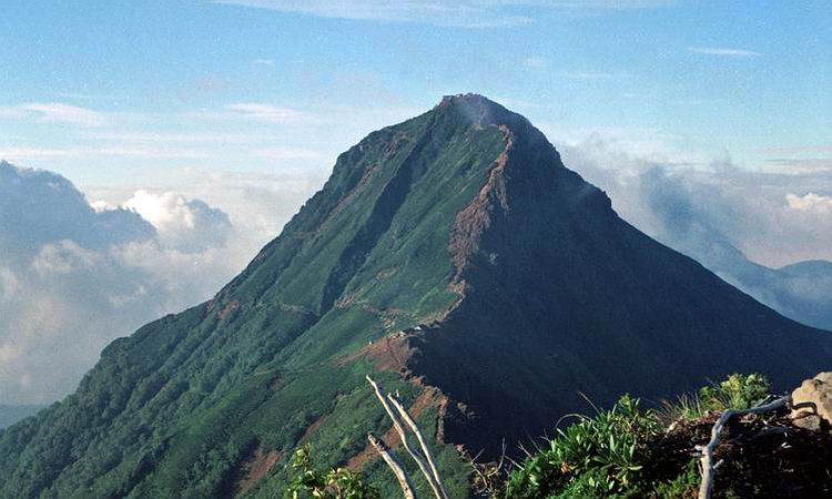 | 東天狗岳からの硫黄岳と爆裂火口。 |