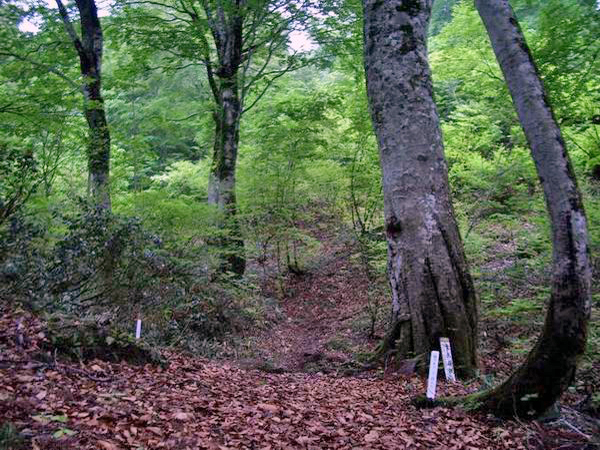 | 7時ちょうどに、これからのきつい登りを覚悟して“鬼ヶ面眺め”を出発する。 平坦な道を少し行くと再びブナの樹林帯に入り、“熊合せ”と書かれた大木の間を通る。 木陰の道を歩いていると、まだまだ新緑といってよい樹々の葉を抜けてくる冷たい風が火照った体に心地よい。 |