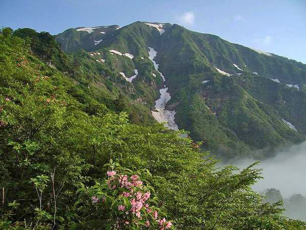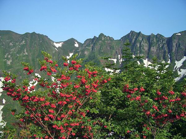 | 剣ヶ峰付近からのムジナ沢カッチとベニサラサドウダン。 |
