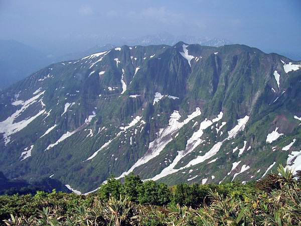 | カヘヨノボッチへの道を下ってゆくとネズモチ平から登ってきたパーティに出会った。 花の様子を聞いてみると肝心のヒメサユリはまだとのことだった。仕方がないので引き返して再び浅草岳に向かう。 その途中の前岳との鞍部から守門岳を見るが霞んでいてはっきりしない。 |
