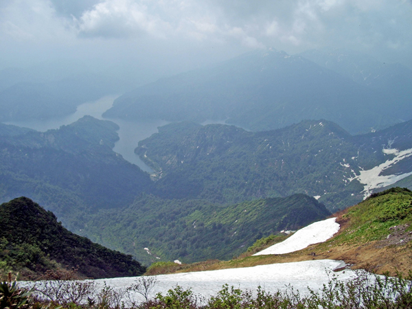 | やがて道は樹林帯を抜けて小さなつづら折りの急登になる。 振り返ると鬼ヶ面眺めが遙か下になり、その左手遠くに田子倉湖が見える。 漸く雲海も切れ始めて南の空も晴れて来てはいるが、全体的に霞がかかっていて遠くの見通しはよくない。 |