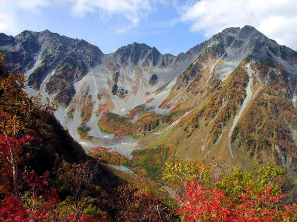 パノラマ新道から見た横尾本谷上部と槍ヶ岳。雲も切れて青空が広がる。