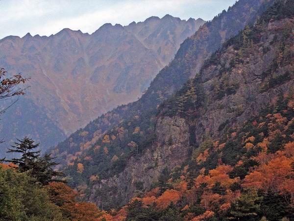 本谷橋手前から紅葉の横尾谷と北穂高を見る。