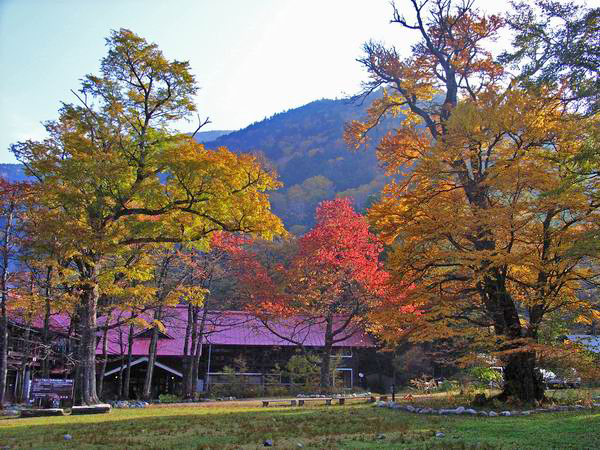 梓川を渡り明神池近くの嘉門次小屋に立ち寄る。後方は明神岳。