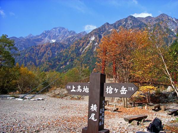 横尾は穂高、槍、蝶ヶ岳への道の分岐点。吊橋を渡って横尾谷に入る。
