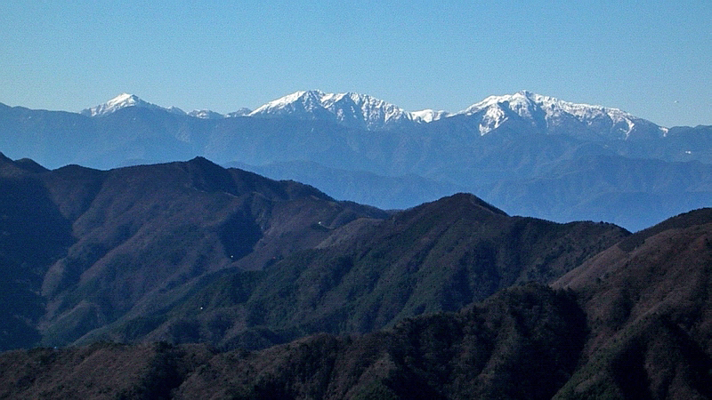 | それを補ってあまりあるのは西の空に銀嶺を連ねる南アルプスの山々だ。 左手から聖岳、赤石岳、悪沢岳、塩見岳、農鳥岳、間ノ岳、北岳、仙丈岳、鳳凰三山、甲斐駒ヶ岳と 3000m級の峰々が横一線に展開する姿は豪快そのものだった。 |