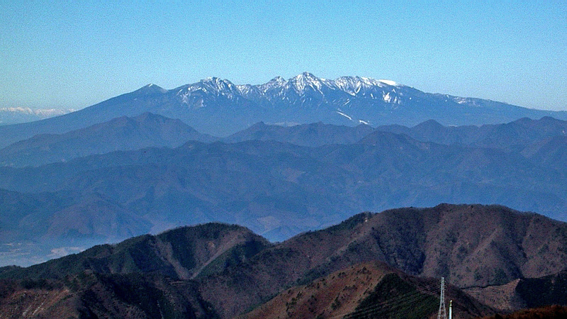 | 北側にはかつて富士山と覇を競ったとされる八ヶ岳が左右に長い裾野を引いていた。 そのほか、甲府盆地の遙か彼方の北アルプスの白銀の峰々や八ヶ岳の右手の奥秩父の山々、東の彼方の丹沢山塊、 富士山の左手に霞んで見える天城連峰など360度の眺めを恣にする展望は飽きることがなかった。 |