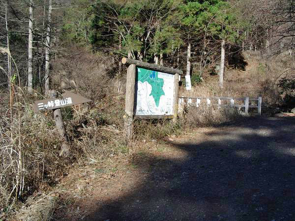 | 頻繁に往来する車に注意しながら20分ほど行くと、“三つ峠グリーンセンター”というリクレーション公園に着く。 大きな案内板が立っているので見てみると、三つ峠頂上までまるで絶壁を登るような登山道になっている。 少しオーバーな表現かも知れないが急登が続くことには違いないだろう。 |