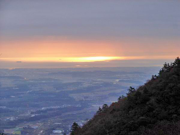 | やがて傾斜も緩くなりアセビの林を抜けると突然目の前に伊勢湾の眺めが広がる。 あちらの方は晴れているのだろうか、海面が金色に輝いている。 |