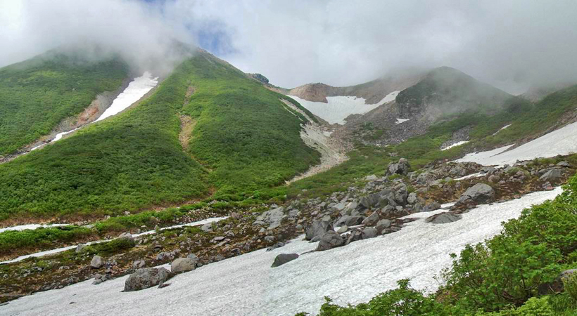 | つづら折りの道を登り、小さな雪渓を横切って午前6時15分にカンクラ雪渓が望める所に出る。 早朝にもかかわらず、例年より多そうな残雪を覆い隠すように早くも雲が湧き始めている。 |