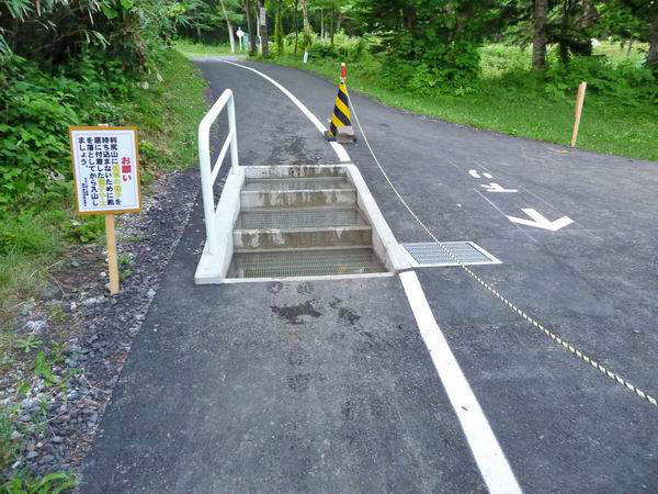 | 登山口は登りと下りが分けられており、登りの道には写真のような洗い場があって、 そこで靴に着いている種子などを洗い落とすようになっていた。 |