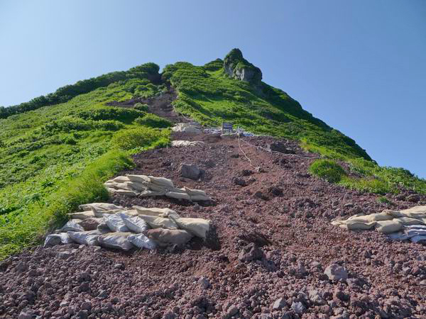 | 沓形道分岐近くの登山道。赤く滑りやすい火山礫の道で、頂上直下まで続く。 |