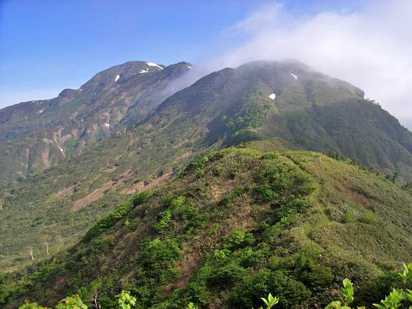 | 山頂で待つこと1時間ほどでようやく霧が晴れ始めた。手前から一ノ峰、二ノ峰、三ノ峰と続く山並み。 |