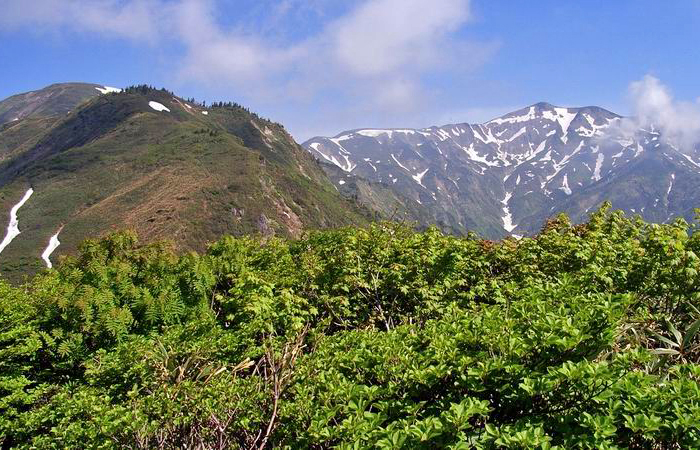 | 帰途、前衛峰から銚子ヶ峰(左)と別山を振り返る。 |