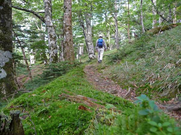| 大峰山らしい、小さな笹に覆われた尾根道を行く。 道端には距離を示す石の道標が随所に設けられていた。 |