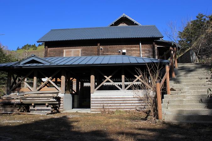 | 神社からちょうど2時間掛かって萬岳荘に到着。 立派な山小屋だがまだ営業はしていない。 |