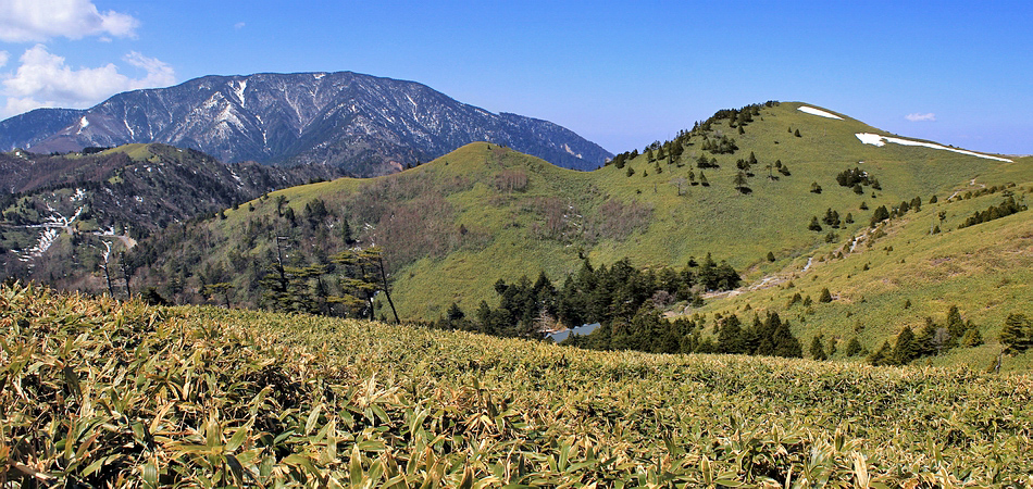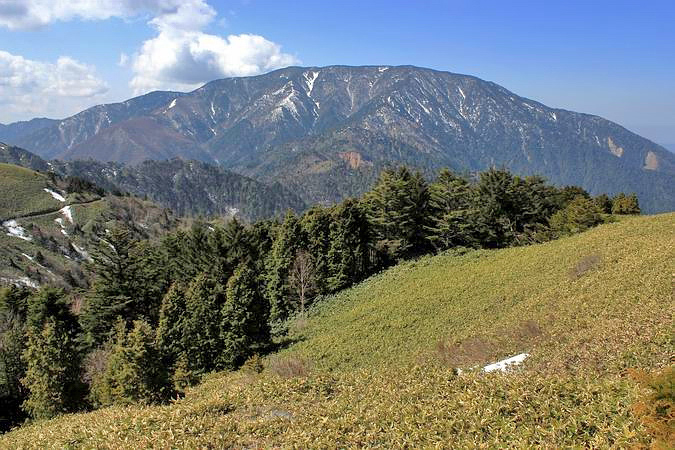 | まず振り返り見れば、歩いてきた笹原の彼方に恵那山が膨大な姿を見せている。 神坂峠から主稜線(正面右手の尾根)を辿って行くルートがあるが、なかなか歩き応えがありそうだ。 |