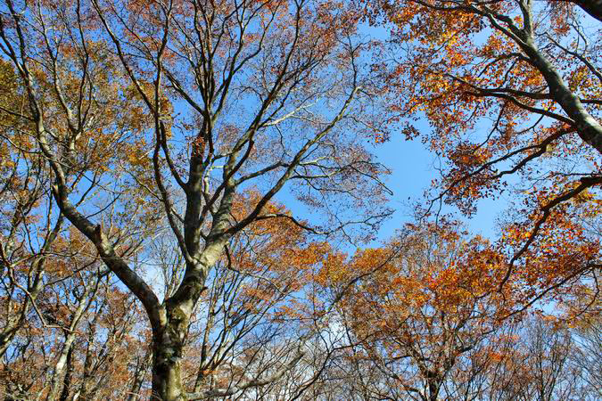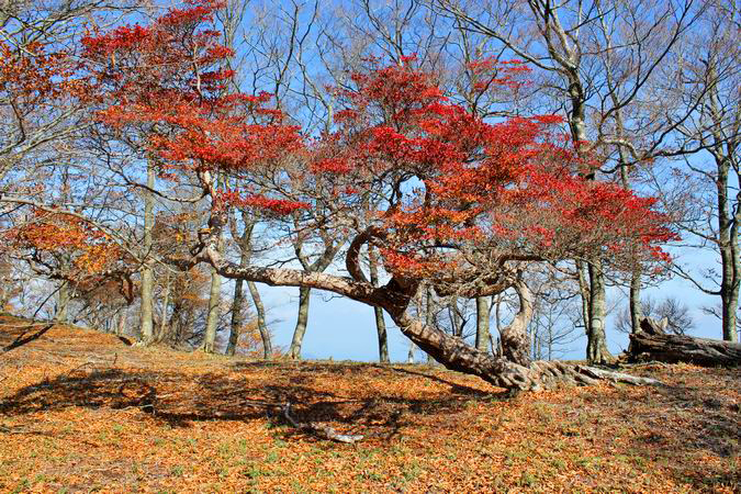 | 9時ちょうどに明神平に着いて東屋で一休みする。 ここは峠のような地形で吹き抜ける風が冷たく軽くかいた汗が一気に引いてゆく。 明神平の手前では既に紅葉は散ってしまっていたが、国見山への斜面にはまだ少し色づいた葉が残っている。 |
