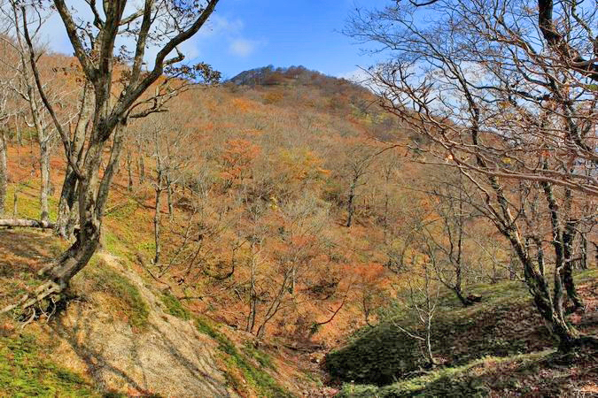 | 稜線上の木々は既に冬の装いだが、少し下がった斜面にはまだまだ紅葉が見られる。 |