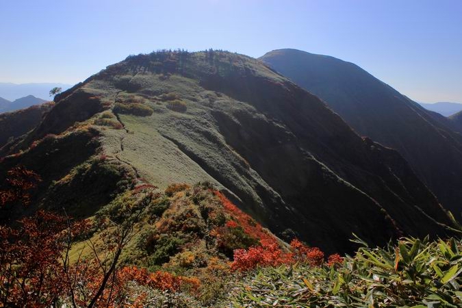 | 兎岳の登りから大水上山を振り返る。稜線付近は紅葉の盛り。 |