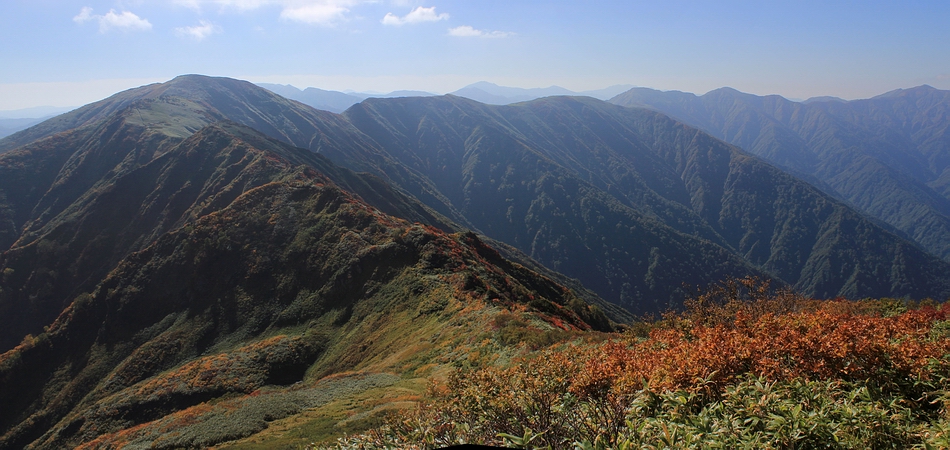 | やがて左側の展望が開けた場所に出た。 丹後山とシシ岩と思しき尾根が見える。 |