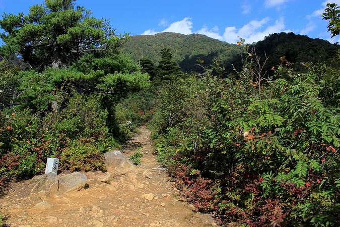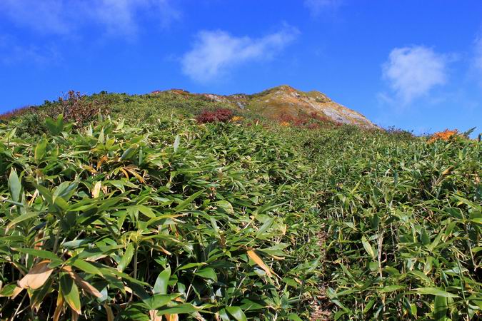 | 九合の池ノ段まで登れば、荷物を置いて空身で頂上まで行くことができる。 急登が続くがあと一頑張りと言い聞かせて登って行く。時刻は9時半ごろ。 |