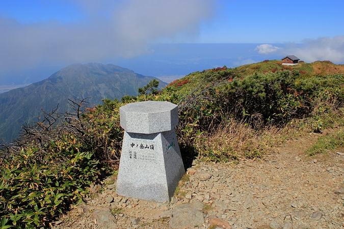 | まずは北東の方向に見えるのは御月山。このあとオカメノゾキを経て八海山へと続く。 その右には日本海も見える。 |