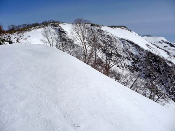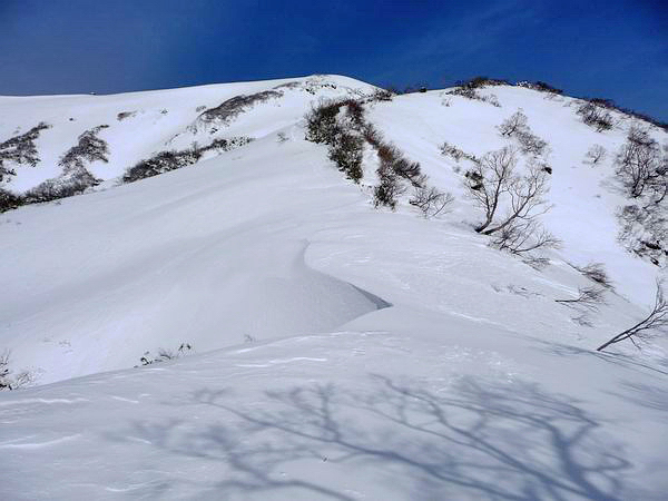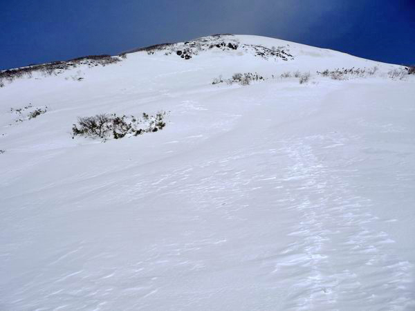 | 稜線上は風が強く、所々吹きだまりやシュカブラができていた。 |
