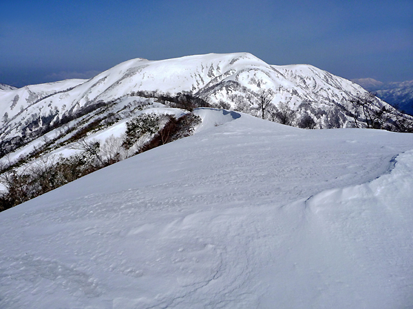 | 鞍部近くから能郷白山を見る。どっしりとした重量感のある大きな山だ。 |