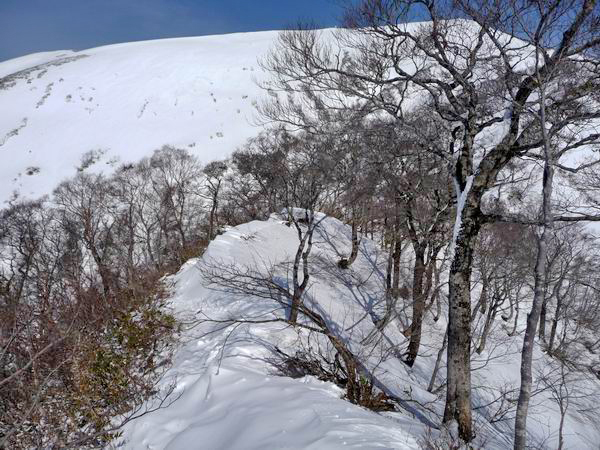 | 第2ステップを登ったところから山頂部を見る。 微かな踏み跡を辿って第3のステップを登る。雪は柔らかく、少し潜るところもあった。 |