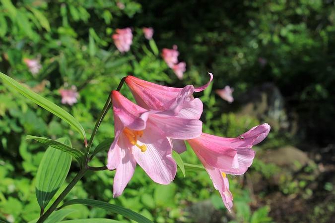 | 鞍部付近で三たびヒメサユリの群落に出会う。 日が高くなってピンクの色も一段と鮮やかに見えてきた。 |