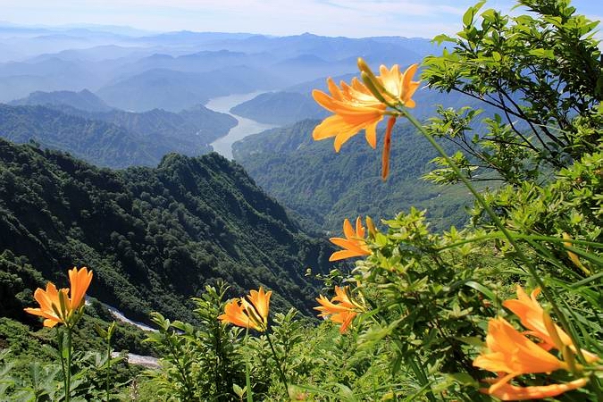 | 鬼ヶ面山とヒメサユリ。 このような怖い名前の山にこんな可憐な花が咲くとは・・・。 |
