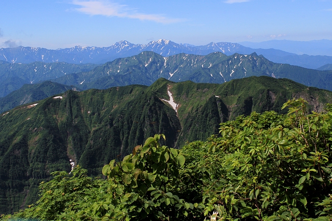 | 鬼ヶ面山山頂から毛猛山の彼方に越後三山を見る。 |