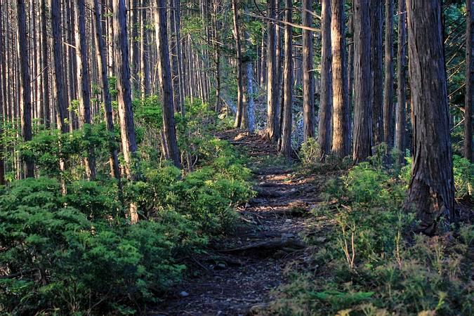 | 柏木道の下部は杉の植林帯が続くが、一部自然林が残っているところもあった。 |
