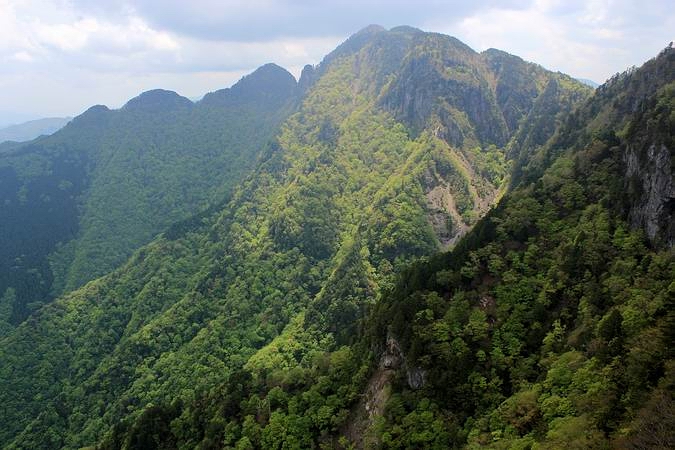 | 伯母谷覗きからの一番の眺めはなんと言っても 谷底から1000mの高度差を有する大普賢岳の雄姿だろう。 (クリックすると画像が拡大されます) |