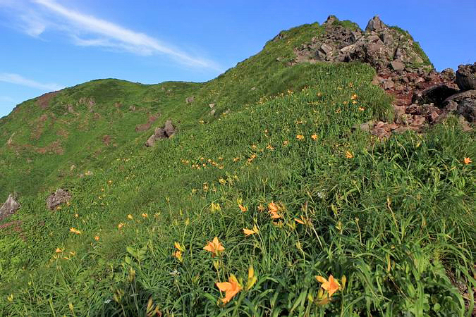 | やがて目の前に男岳が迫ってくる。 ニッコウキスゲも現れてきて高山の雰囲気満点です。 |