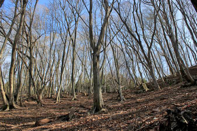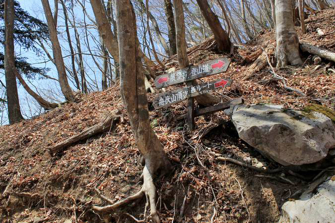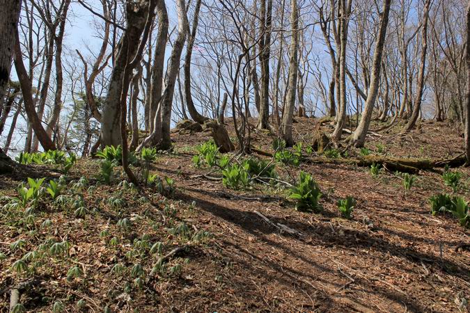 | 斜面を抜けると芽吹き始めたばかりの自然林の中の道となります。 新緑や紅葉、そして霧氷の時期などはさぞかし素晴らしい景色となるに違いない。 |