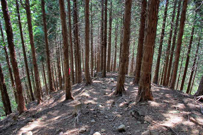 | 伐採地が終わって主尾根に乗ると植林の中の道となる。 |
