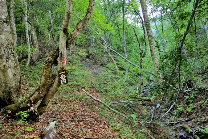 | 一合目からは急登が始まる。所々にロープが張られているかなり急な登りだった。 しかしまわりは新緑が日に映えてなかなか綺麗。 |