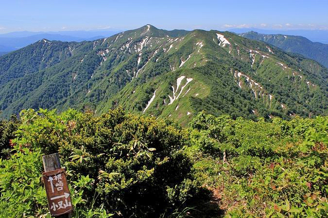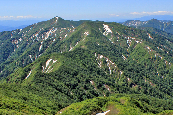 | 稜線を挟んで左手には天狗森から小又山にかけての稜線が続く。 こちらも彫りの深い高山の様相を呈していた。 |