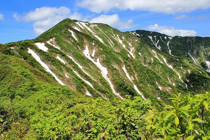 | 五合目と六合目との間で見た神室山から軍沢岳へと続く稜線。 |
