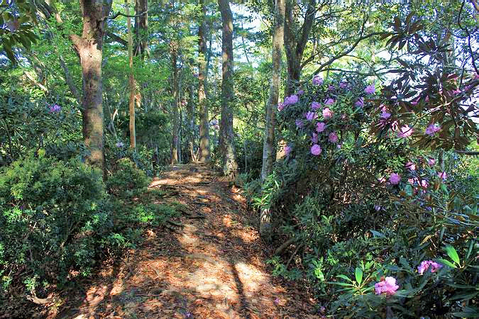 | 登山道沿いには満開のシャクナゲ。 |