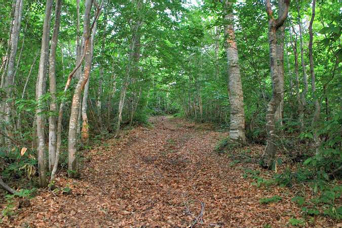 | ブナ林の中を下って行きます。急な坂道はないので足への負担が少なくて助かります。 |