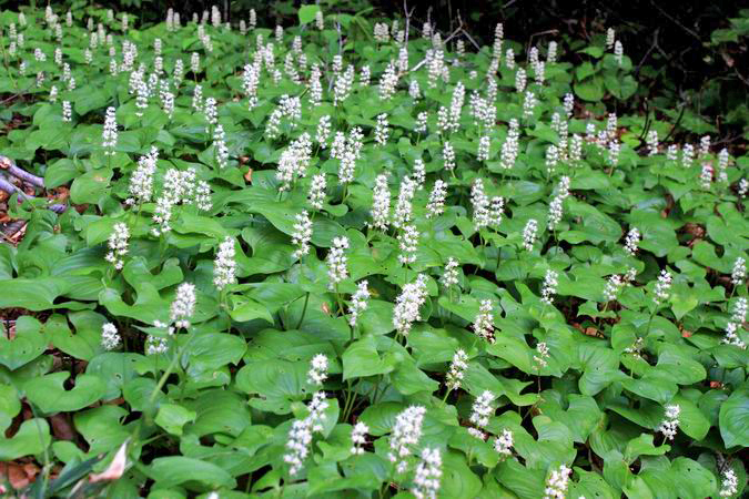 | マイヅルソウの群落。この花はヒバクラ湿原の手前までずっと咲き続いていました。 |