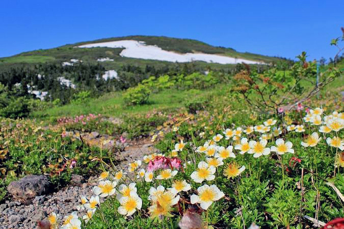 | 午前7時10分に山人平に到着しました。 天気は予想外によく、青空を背にした雪を残した森吉山もバッチリですが、 やはりチングルマの最盛期は過ぎていました。1週間ほど遅かったようですが仕方ありませんね。 |
