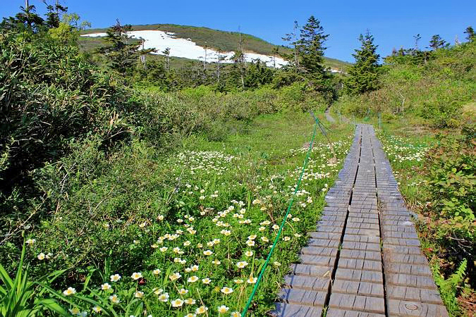 | 森吉山を眺めながら山人平の木道を進んでゆきます。 |